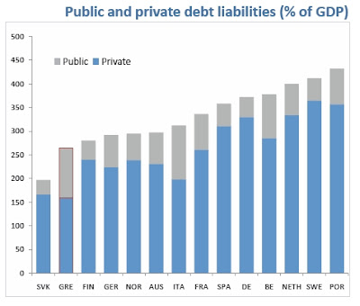 (Állami és magánszektor adóssága a GDP százalékában; forrás: Greece is changing)
